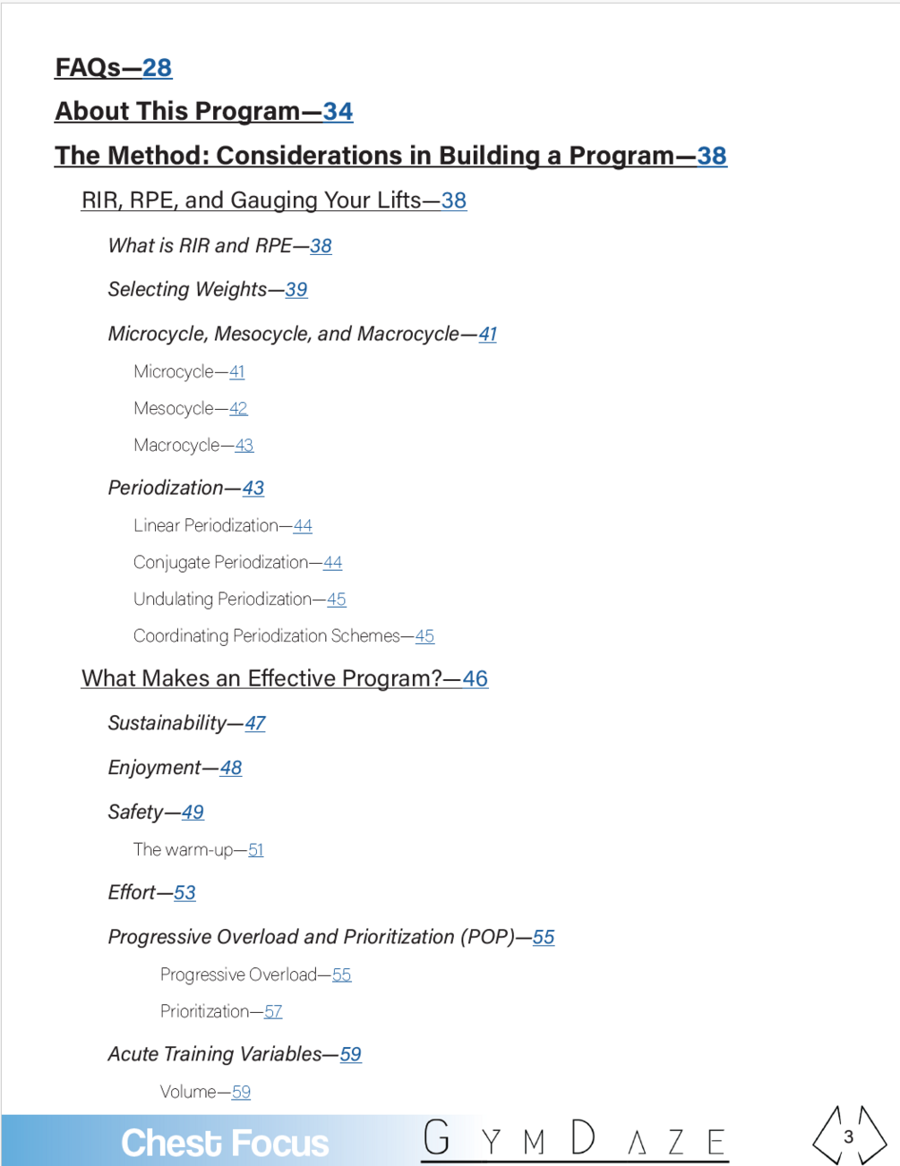 A full workout program, substitution exercises, anatomy chart, gym glossary, FAQs, program description, and a fully developed research section